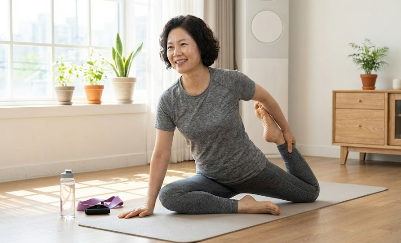 빠른 걷기 30분 또는 실내 자전거·요가 20분. 땀보다는 지속성이 핵심입니다.